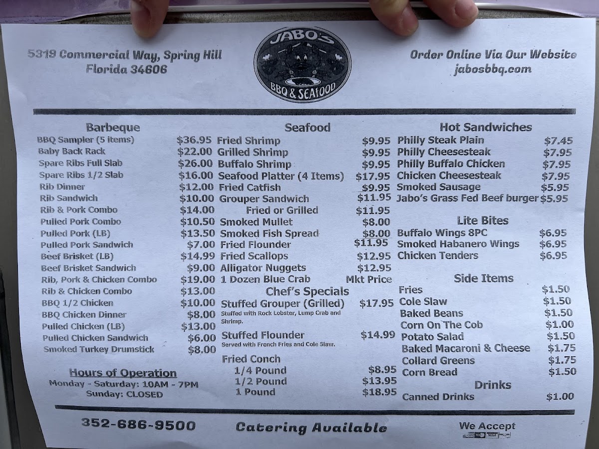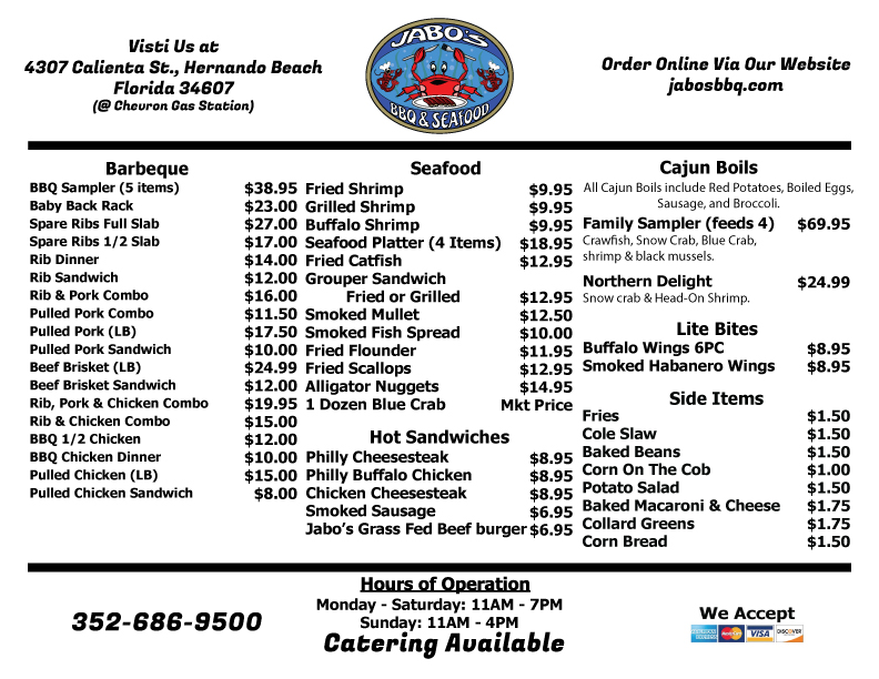 At Jabo's Bbq And Seafood (3335 Shoal Line Blvd, Hernando Beach), the menu feels like a satisfying “best of both worlds”-fresh-from-the-water seafood and no-nonsense barbecue classics, with plenty of casual add-ons to round out the meal. Seafood lovers can keep it simple with Live Blue Crab (large) and Steamed Blue Crab (large), or lean into Florida staples like Grouper Sandwiches and Grouper Sandwich (Fried or Grilled), plus comfort favorites such as Fried or Grilled Shrimp, Fried Catfish, Smoked Mullet, and Smoked Fish Spread. On the BBQ side, it’s the kind of lineup you expect when a place takes smoke seriously: Beef Brisket, Chicken, Pulled Pork, Spare Ribs, and Baby Back Ribs-all straightforward, hearty options that pair well with classic sides. If you’re in more of a handheld mood, the sandwich section delivers variety with Philly Cheesesteak, Chicken Cheesesteak, Smoked Sausage, and the standout Jabo's Grass Fed Beefburger. For lighter snacking, Buffalo Wings, Smoked Habanero Wings, and Chicken Tenders make easy shareables or quick bites. And to finish it off the right way, the sides keep things familiar and filling-French Fries, Cole Slaw, Baked Beans, Corn on The Cob, and Potato Salad-the kind of supporting cast that turns any seafood basket or BBQ plate into a complete, crowd-pleasing meal.
